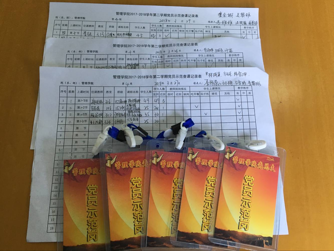我党总支积极响应校党委“六创争先”的号召,不断摸索和创新学生党建工作。据悉,“党员示范查课”将持续开展一个学期,此次活动旨在“党建创强”,通过实行“挂牌上岗”制度,强化学生党员的党员意识、责任意识、争优意识,以榜样树学风、以活动促学风,激励党员每天都有新的精神状态、每天都有新的进步,树立共产党员的良好形象,助力天天摸天天操建设优良学风。(杜心田/文 天天摸天天操党总支/图)