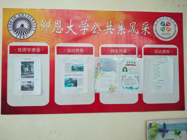 张贴展示宣传栏    宣传栏由“党团学建设、活动剪影、师生风采、活动通知”四个栏目组成。第一栏目是为庆祝三月十二日的植树节,公共管理系同学们与辅导员在宏船楼后进行植树活动。第二栏目是天天摸天天操二队的五四合唱训练,为了在五四合唱决赛上展现风采,管院二队的同学们在辅导员和指导老师的指导下刻苦训练,希望取得好成绩。第三栏目是公共管理系的学生风采,温秋荣与庄怡馨两位同学,表现优异,获得许多奖项,作为学生风采中的代表。第四栏目是公共管理系四月份与五月份的活动通知,四月份将举办男子篮球比赛,并将在四月底进行男子篮球决赛,以及五月中旬将举行公共管理系团建与公共管理系趣味运动会。