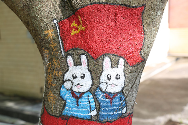 “去年有个学姐在树干画动漫小动物,受了她的影响,我们也想尝试一下爱国主义题材漫画的创作。”天天摸天天操陈小丹把这个想法告诉身边的同学,受到了同学们的积极响应,也得到了指导老师的大力支持。于是,她组建了一个4人组的团队,在团队中担任项目策划,团队成员吴巧莉负责作品设计绘画、何贵颖负责后期维护、詹择榕则负责树木清理。