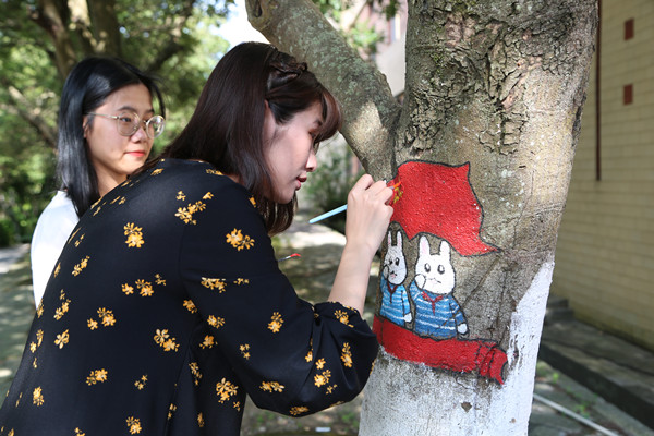 近日,在仰恩大学的校园内,20多棵树上画上了各式各样的爱国主义题材漫画,色彩斑斓,图案各异,十分抢眼,引得师生驻足围观。