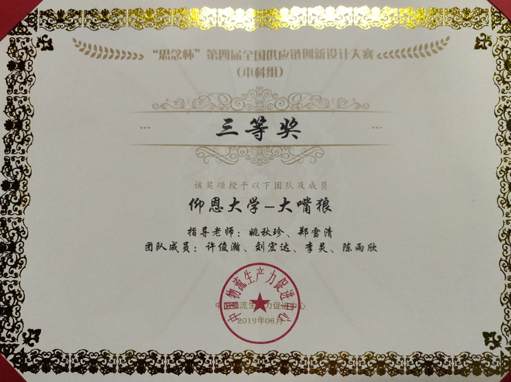 近日,由中国物流生产力促进中心主办,青岛农业大学、中国管理科学学会供应链与物流管理专业委员会承办的“思念杯”第四届全国供应链创新设计大赛在青岛落下帷幕。我院许俊瀚、刘宏达、李灵、陈雨欣4名学生组成的“大嘴狼队”在姚秋珍和郑雪清两位老师的带领和指导下,经过半年时间的不断练习、操作、探索,一路过关斩将,在全国总决赛中发挥出色,荣获本科组三等奖。