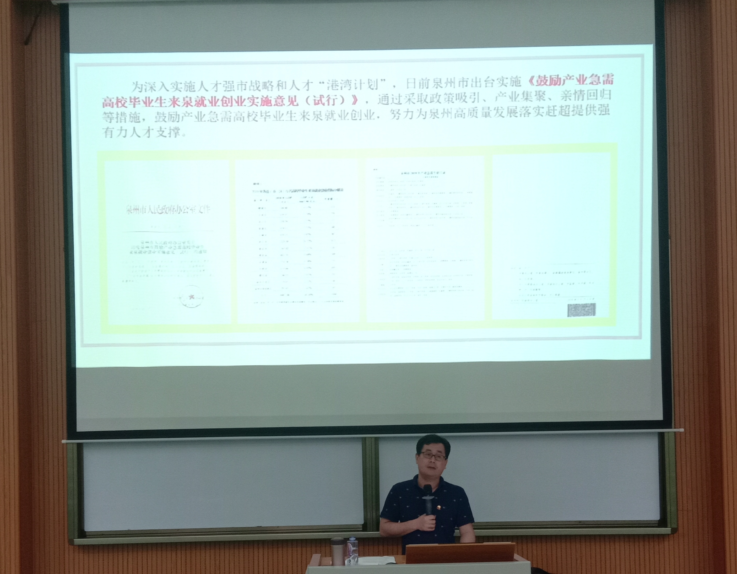 宣传活动现场 李瑞松引用马克思的话“一个时代的性格,是青年代表的性格;一个时代的精神,是青年代表的精神”作为开篇,从“青春建功新时代——新青年需团结,热爱祖国建功当代”和“筑梦泉州新作为——新作为需奋斗,才聚港湾筑梦泉州”两个方面进行宣讲。他强调新时代中国青年要有新思想、新使命、新本领,热爱祖国建功当代,并向在场的团员青年介绍了泉州的经济发展状况、人才扶持政策、就业创业政策,鼓励大家将来留泉就业和创业,奋斗实现才聚港湾筑梦泉州的理想。