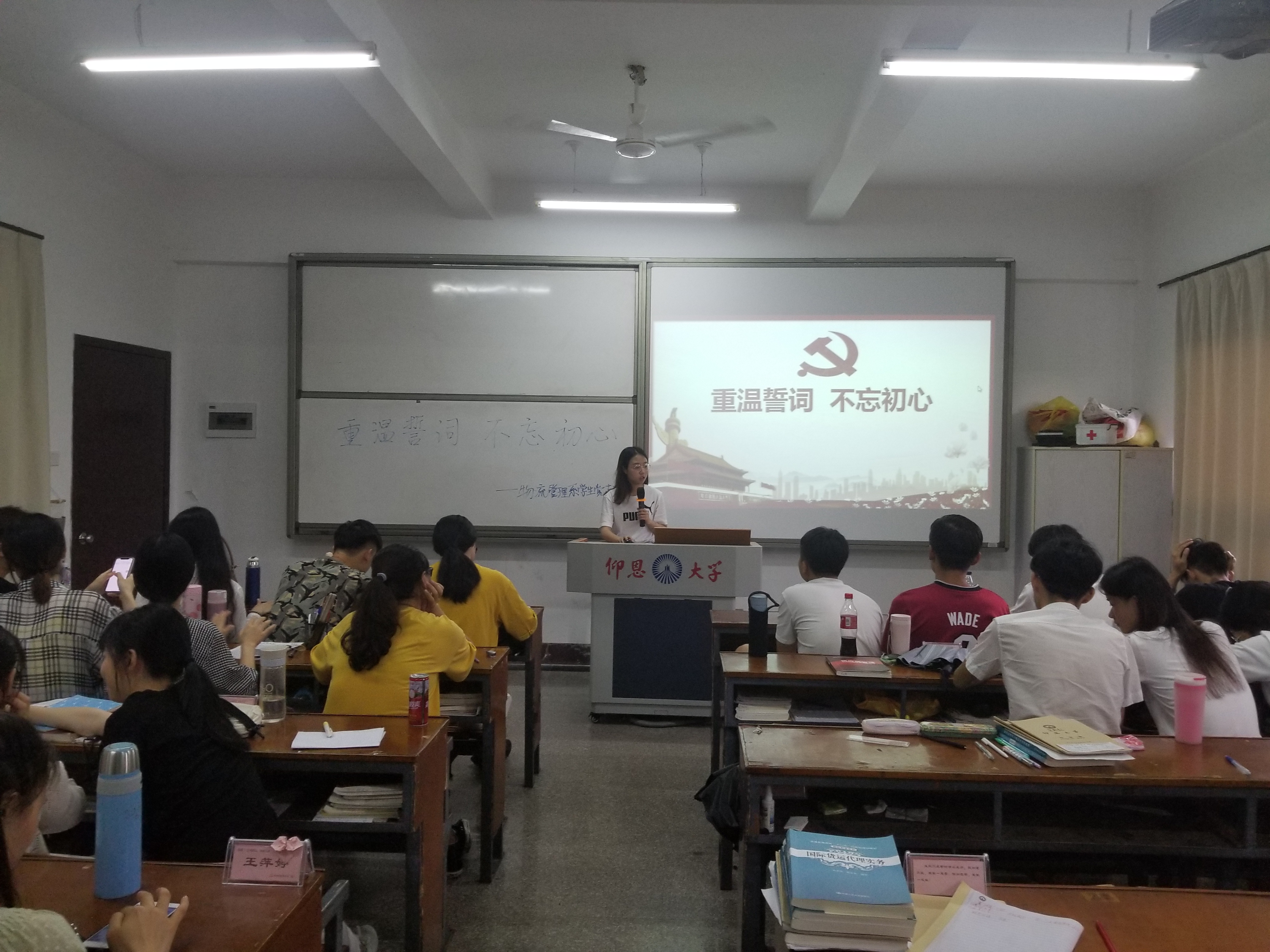6月17日,正值毕业生党员返校之际,为重温爱国情怀,物流管理系学生党支部在共和楼307开展了爱党爱国教育之“重温入党誓词,不忘入党初心”活动。活动由龚江玮同志主持,支部全体成员到场参加,重温入党誓词,牢记自己的初心和使命。