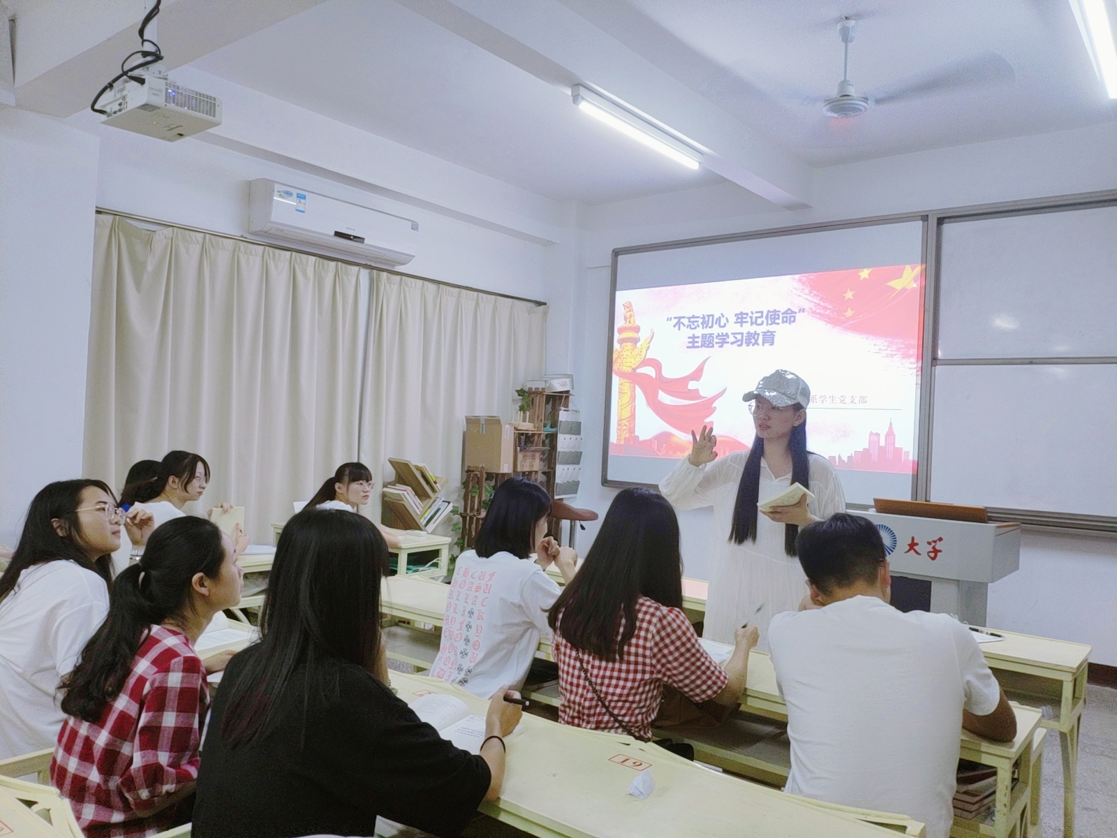 连景霞作动员讲话    会上,连景霞老师作了“不忘初心,牢记使命”主题教育工作计划报告,并向全体党员具体阐述“七个一”的工作内容和要求。同时,她也强调了主题教育的意义,作为新时代的大学生党员,更应该通过自己的实际行动去爱国爱党,为身边的师生服务。