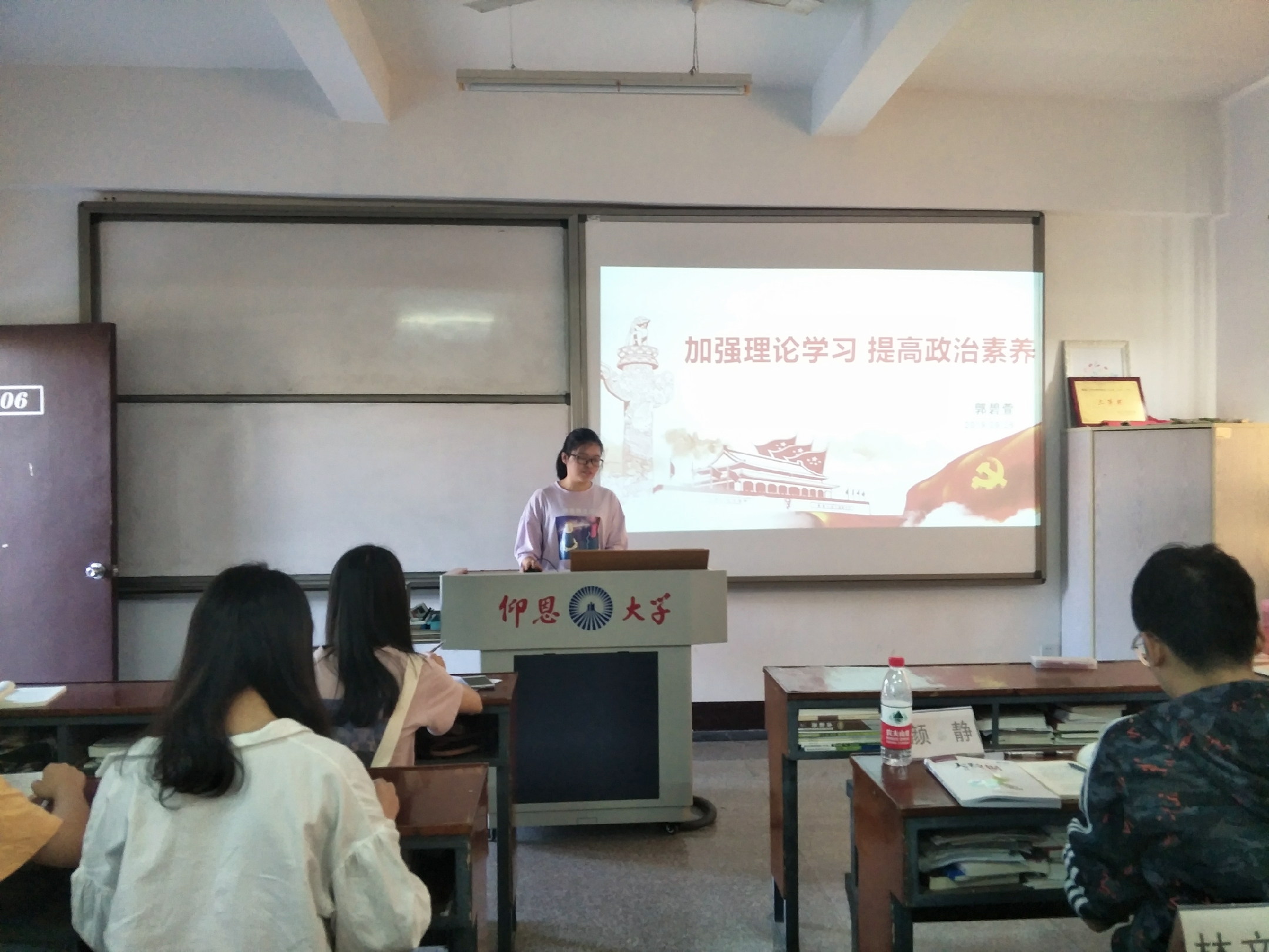 党员学生主讲    会上,主讲人杨冬玉、郭碧萱等两位同志用精美的PPT、生动的语言和饱满的精神,围绕“加强理论学习,提高政治修养”方面的内容进行讲解,使在场党员认识到在学习理论的过程中,一定要紧密结合思想和工作实际,坚持把进一步提高学习本领放在首位,紧跟新时代中国特色社会主义理论的创新内容,切实加强马克思主义理论修养,用党的创新理论武装自己,真正实现用习近平新时代中国特色社会主义思想武装头脑、指导实践、推动工作。