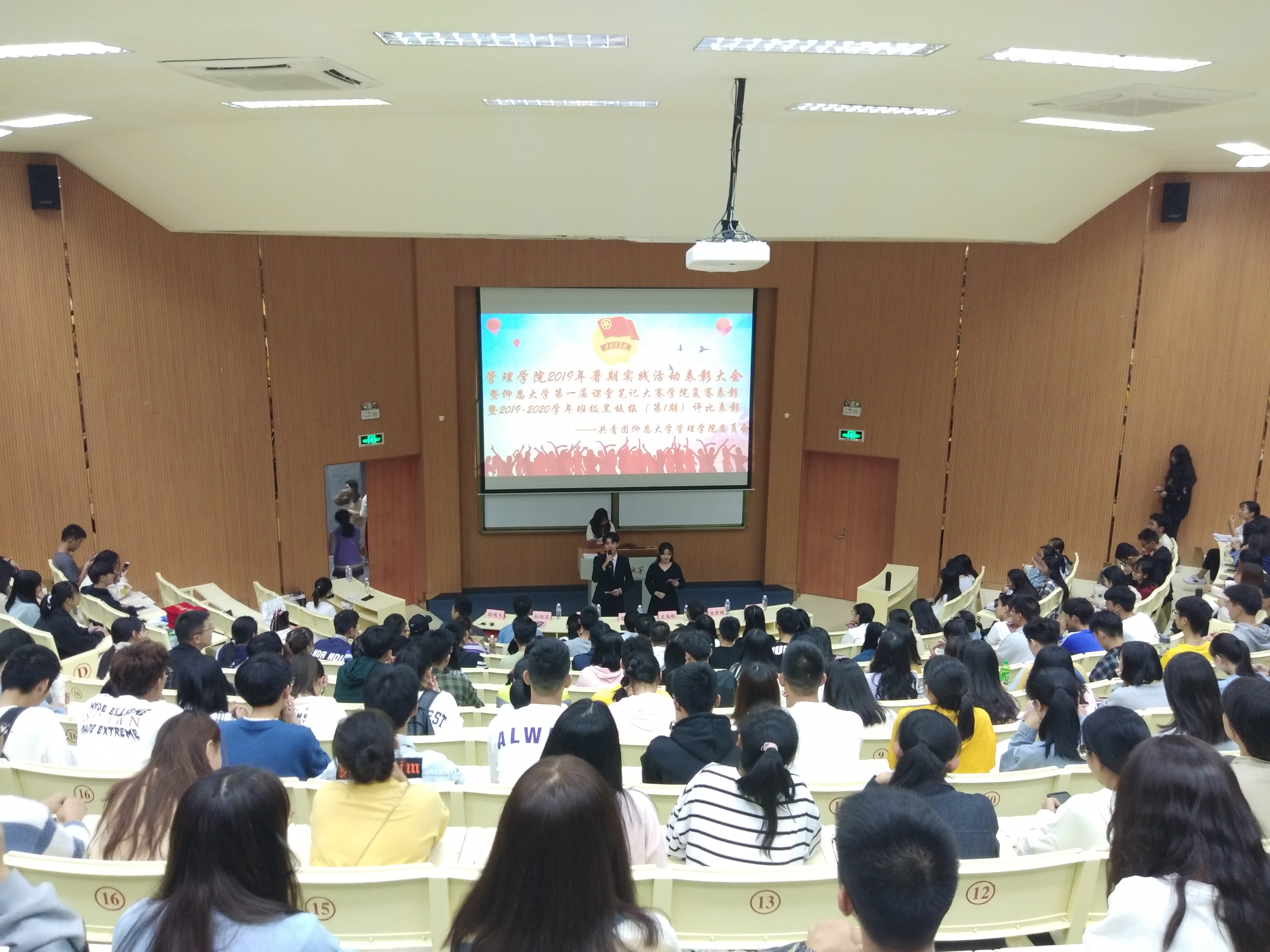 10月31日晚,我院2019年暑期实践活动表彰大会(暨仰恩大学第一届课堂笔记大赛学院复赛表彰大会和2019-2020学年第一期班级黑板报——庆祝新中国成立70周年专题评比表彰大会)在第一教学区和昌教学楼致知讲堂举行。天天摸天天操院长翁景德、副院长庄海刚、天天摸天天操党总支副书记蔡惠丽、院团委书记杜结实、各系团总支书记出席表彰大会,各实践队指导老师、获奖学生代表以及2019级全体大一新生参加表彰大会。