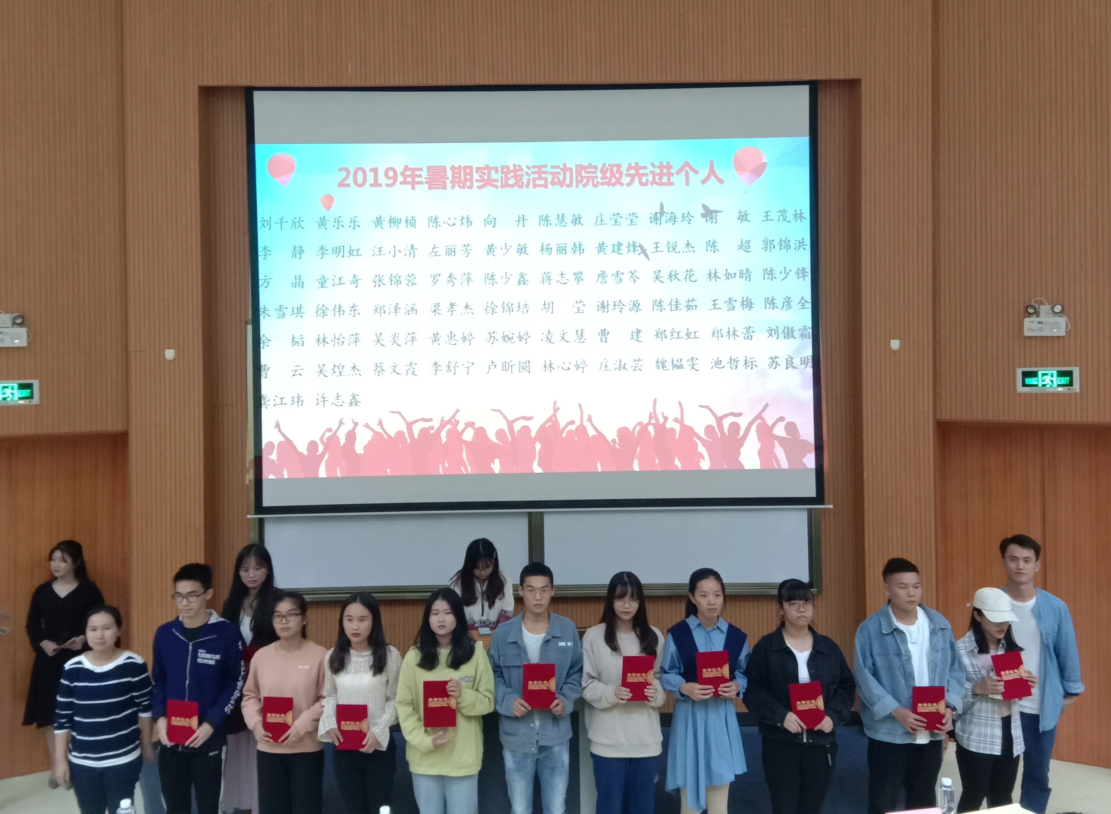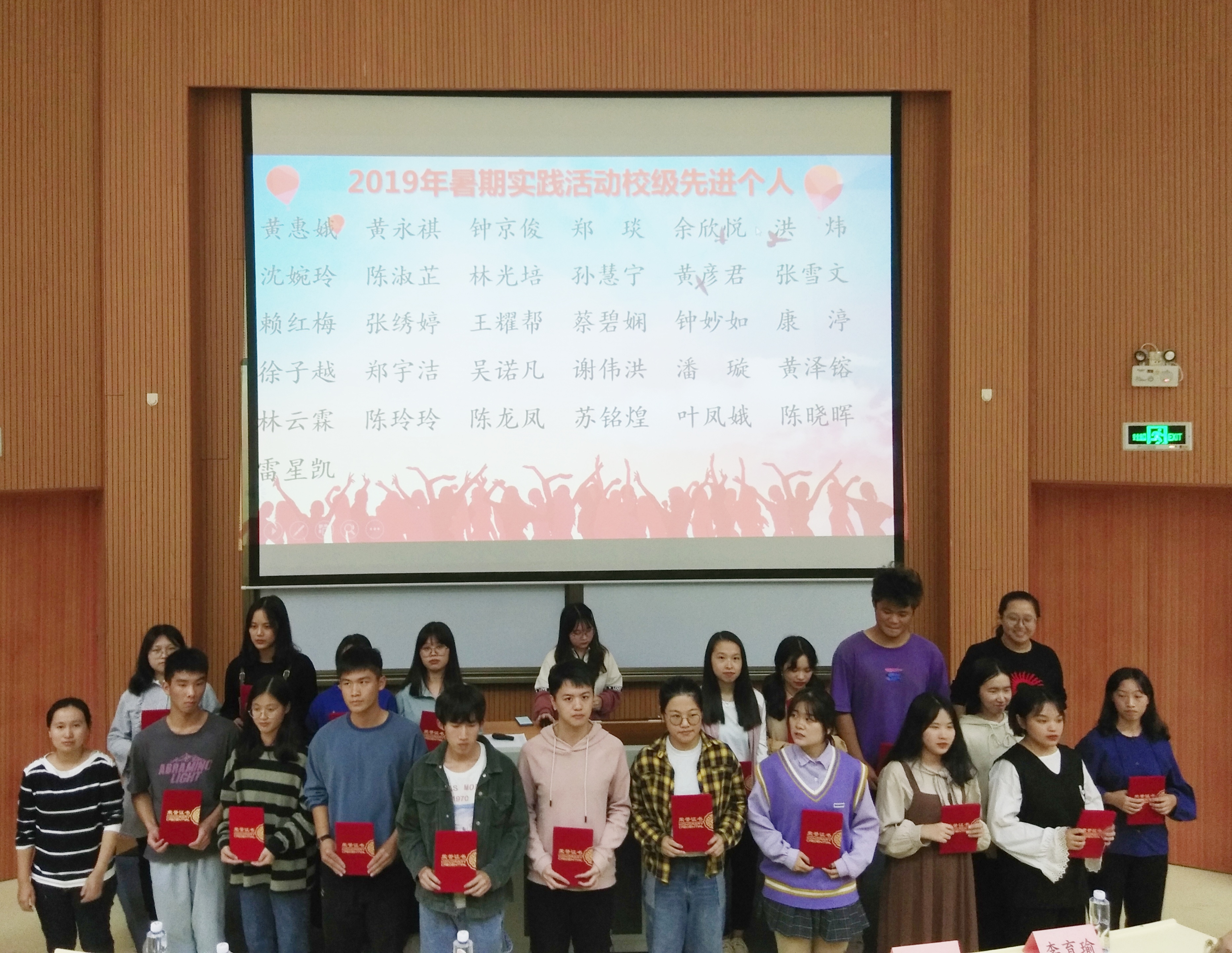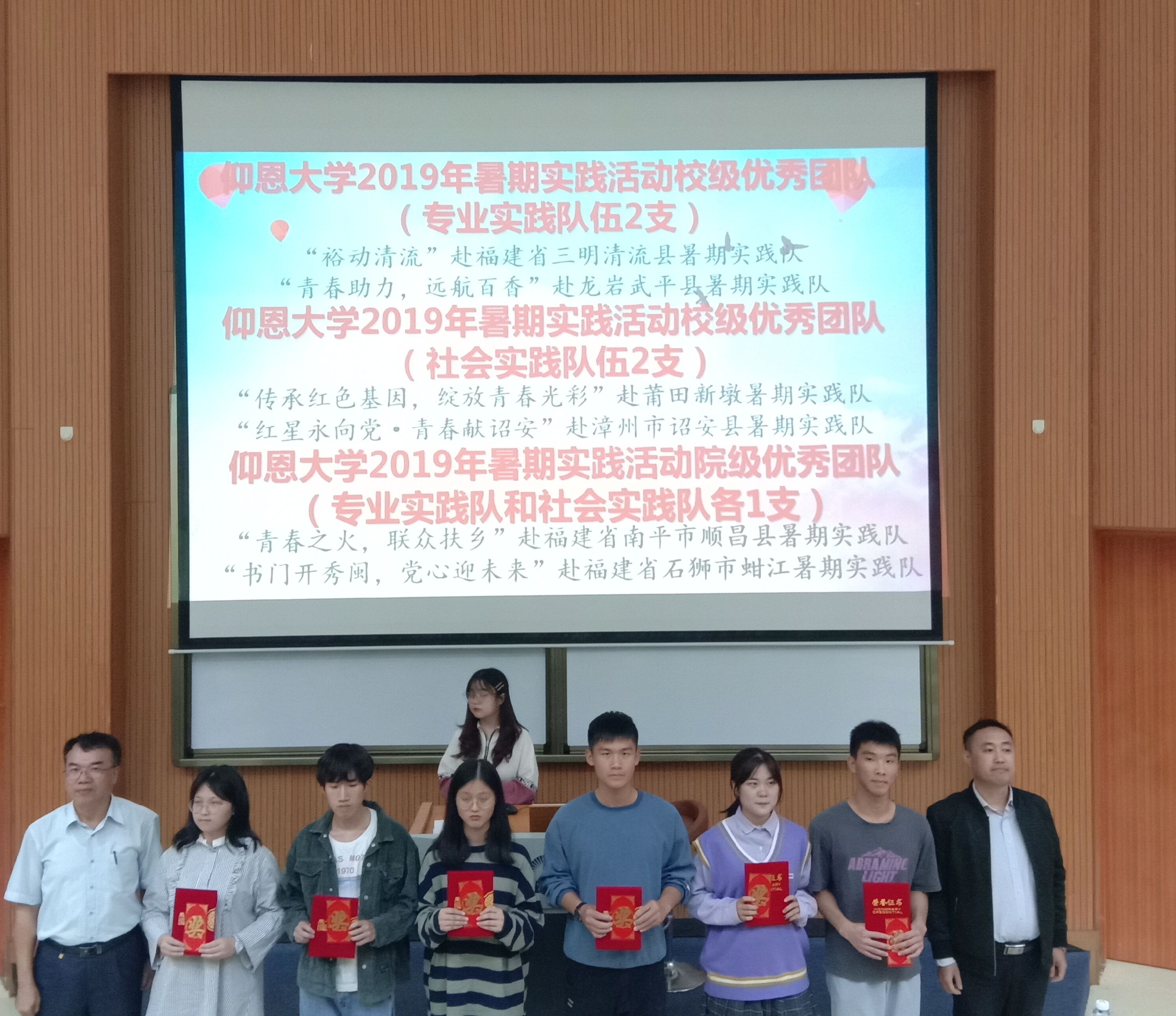 表彰大会现场    “裕动清流”赴福建省三明清流县暑期实践队、“青春助力,远航百香”赴龙岩武平县暑期实践队、“传承红色基因,绽放青春光彩”赴莆田新墩暑期实践队、“红星永向党·青春献诏安”赴漳州市诏安县暑期实践队等4支校级优秀团队学生代表通过PPT、短视频、实物展示等方式,为全体大一新生作经验分享,畅谈实践中的见闻与心得、成果与收获。