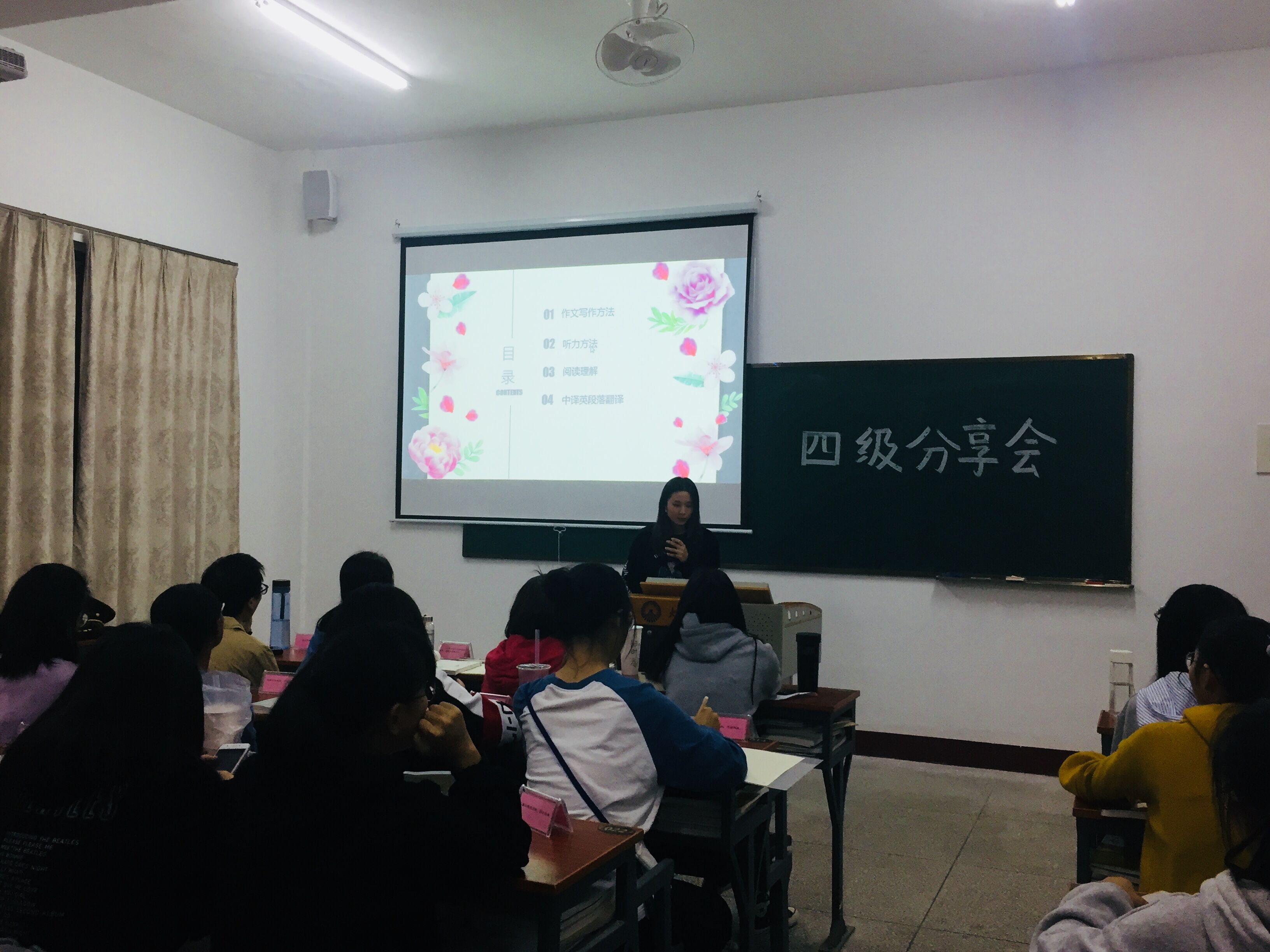 为使同学们更好地备战大学英语四级考试,11月13日,物流管理系团学于第一教学区祥贤楼106教室举办了英语四级分享会。本次活动由2017级物流管理1班吴斯潼同学为新生分享英语四级应试经验与技巧。2019级全体大一学生聆听了此次分享会。