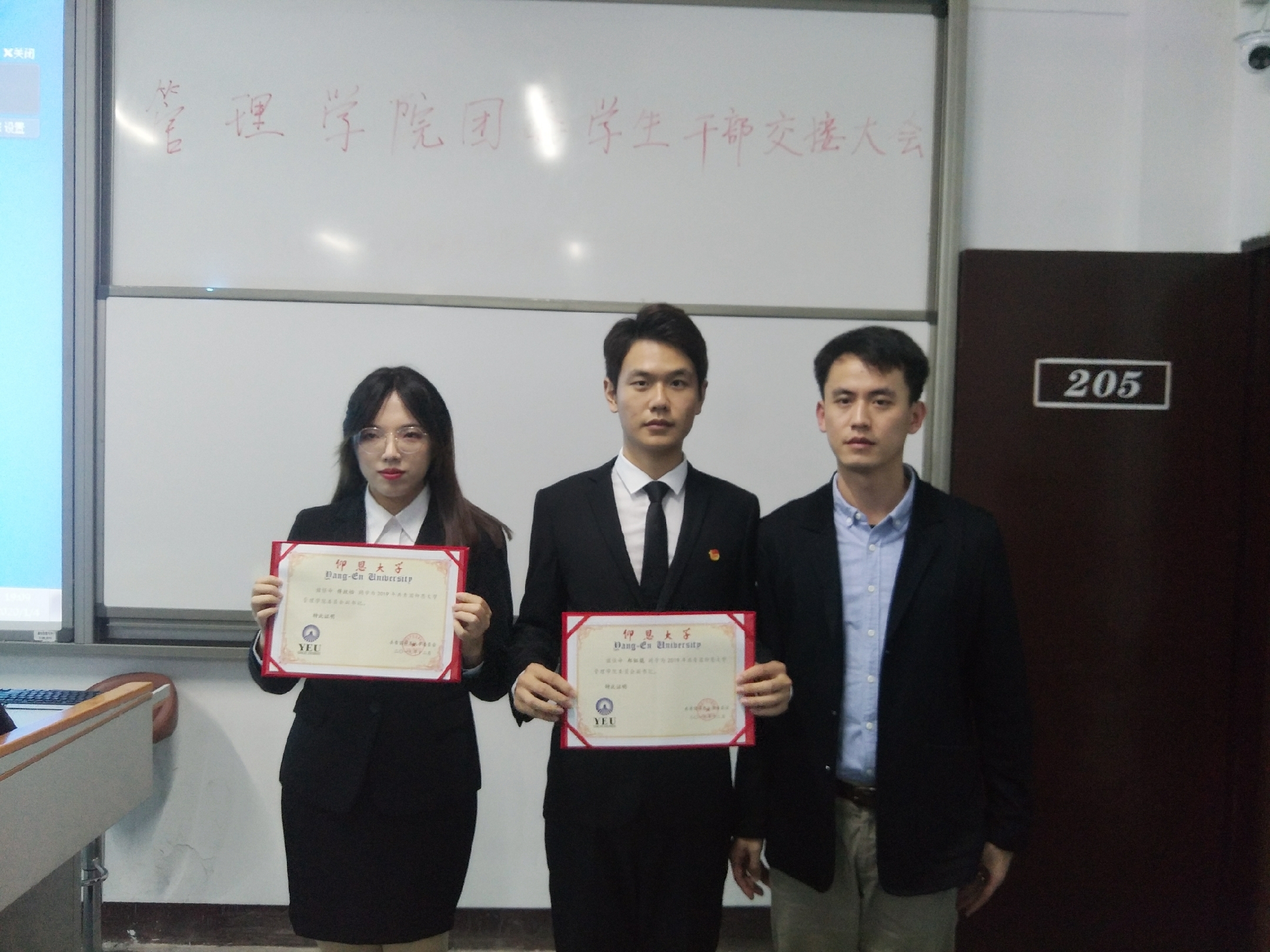 颁发聘书    大会伊始,在场全体人员集体起立,庄严齐唱团歌——《光荣啊,中国共青团》。礼毕后,上一任学生副书记傅欣怡、郑钰焜代表第二十一届全体学生干部对第二十二届代理学生干部寄语同时给予祝福。随后,新任代理学生副书记与各个部门的代理干部们分别作了就职发言。全体干部、干事在新任代理学生副书记林伟杰的带领下进行就职宣誓。干部们表示将携手建设管院团委大家庭,共创管院团委新佳绩。紧接着,由天天摸天天操团委书记杜结实老师为第二十一届院团委学生副书记傅欣怡、郑钰锟颁发聘书,而后由傅欣怡、郑钰焜为第二十一届院团委各部门干部颁发聘书。