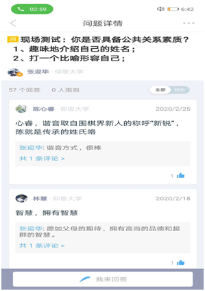 疫情阶段,更多的是帮助学生形成自主学习的发展方式。这学期我主要教授《现代公关能力培育》、《公共关系与公关礼仪》和《市场营销学》课程。一方面引用大学慕课和智慧树上优质的课程资源,另一方面为了让学生更好的理解专业术语,在“慕课堂微信小程序”和“知到APP翻转课堂”平台,采用有效的“问题策略”,增加学生对专业知识的理解,样本对话为: