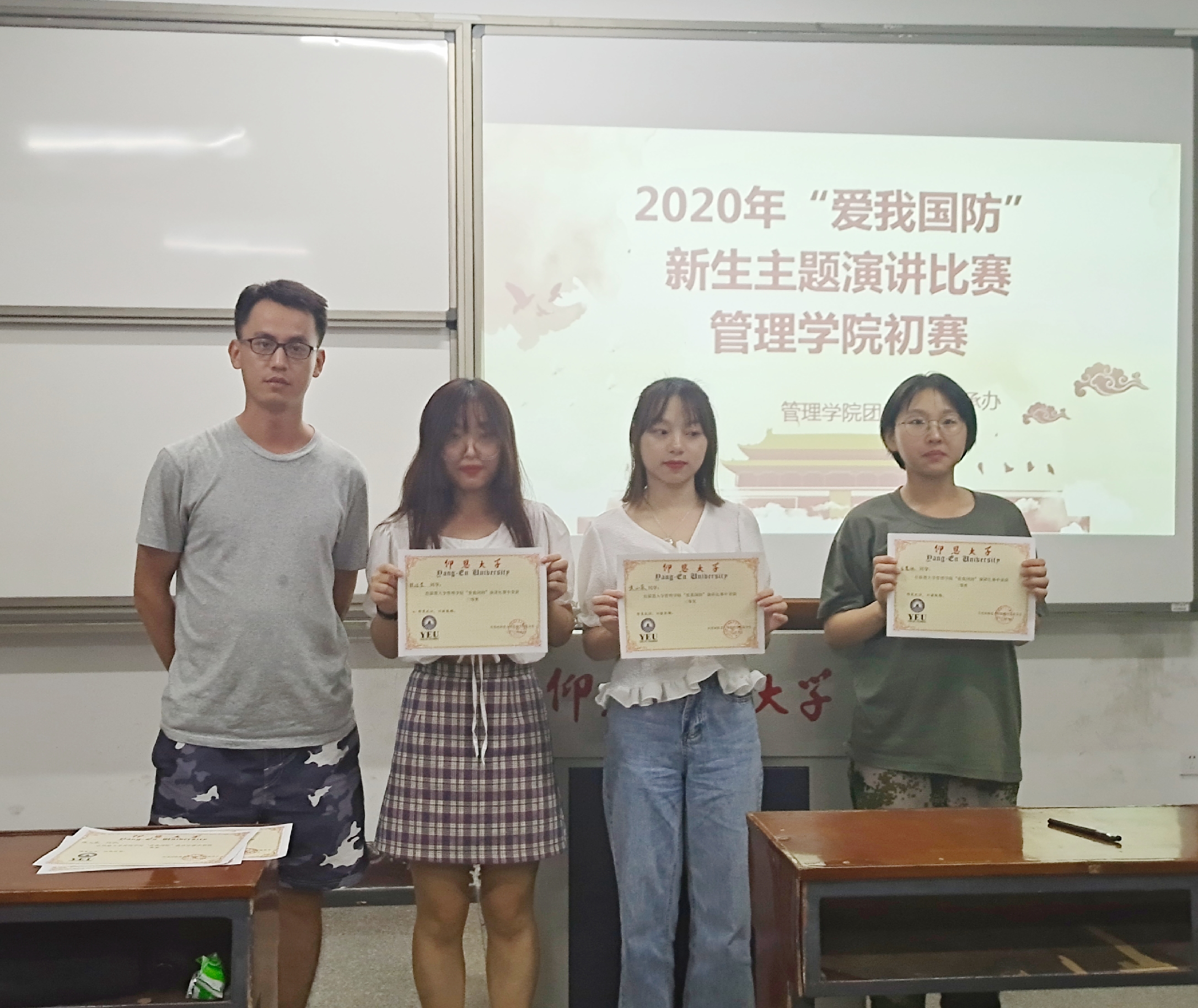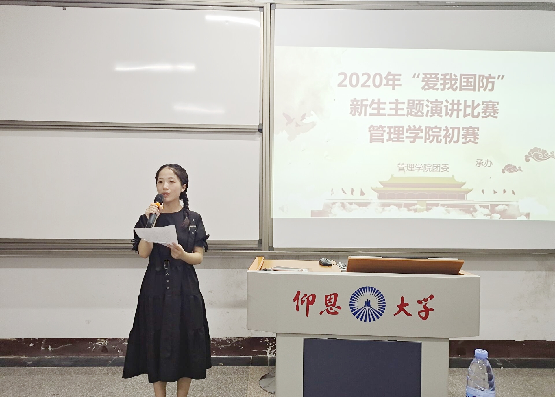 新生演讲    在比赛中,新生们就“爱我国防”展开系列演讲。新生们的演讲内容丰富,有借助我国历史引申出国防的重要性,有借助现实社会来描述中国国防的强大,亦有结合新冠疫情来讲述国防是全民性的。在比赛的结尾,杜结实老师就此次演讲比赛作出总结,并对获奖的同学们表示祝贺。
