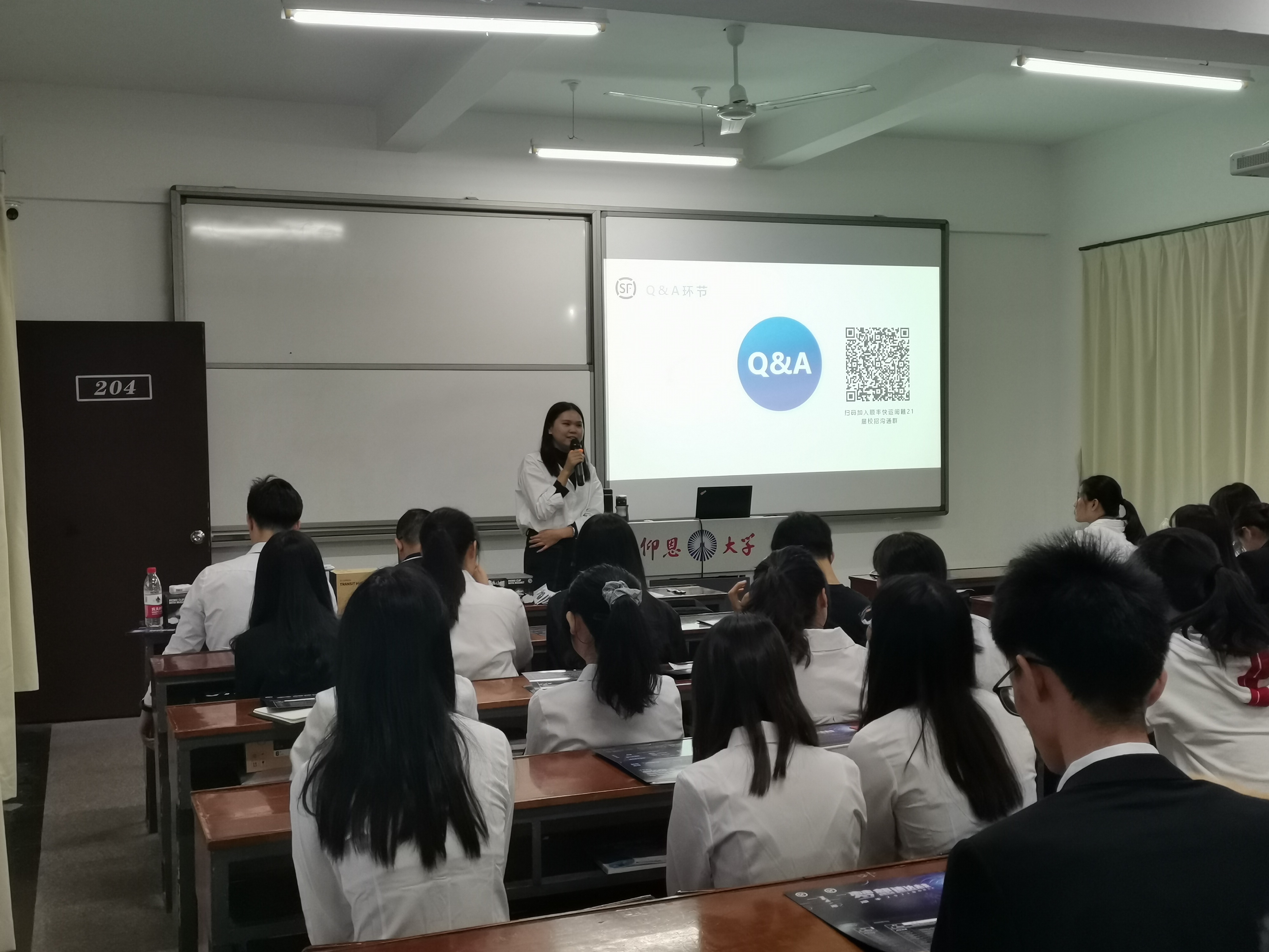 经验分享    招聘会伊始,负责人龙坤通过PPT演讲和视频播放的形式,向学生们介绍了顺丰企业的基本情况,提高了大家对顺丰企业的认识。同时,也为在场的应届毕业生们讲述了顺丰企业的就业岗位、工作要求、员工的发展渠道和薪酬福利等相关内容。接着,由刚毕业入职的学姐分享自己进入顺丰企业的感受和体验,给同学们传递顺丰的企业文化和人文关怀。宣讲会尾声,负责人龙坤给同学们答疑解惑,为同学们具体解释了应聘实习的具体流程、岗位的流动、实习考核要求等问题并对提问的同学发放顺丰小礼品。