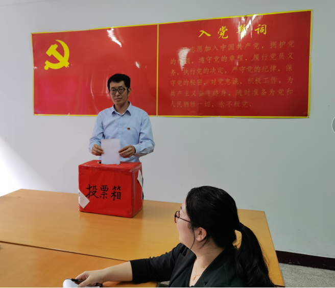 投票 党支部书记李征同志代表上届支部委员会做了工作报告,总结回顾了支部过去一年来的主要工作、取得的成绩和存在的不足,大会审议并通过了工作报告。按照选举的有关规定,本次党员到会率符合选举要求,到会党员同志都投出了自己宝贵的一票,选举产生了新一届支部委员会,随后全体党员在新一届支部委员带领下重温了庄严的入党誓词。随后又召开新一届支部委员会议,并确定了支委分工:由李征同志担任新一届支部书记,张迎华同志任支部副书记,李婷同志任组织委员,王元媚同志任宣传委员。