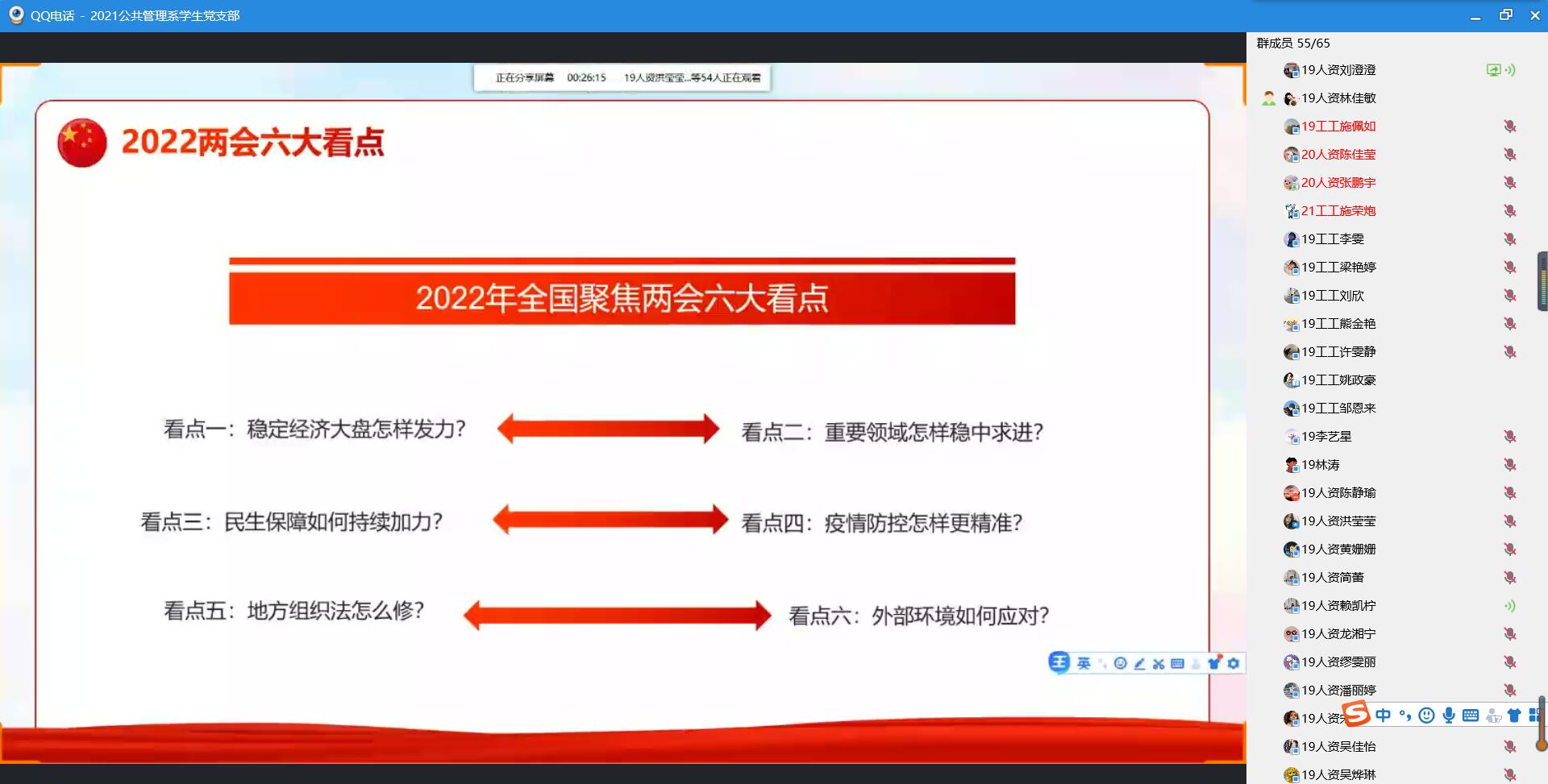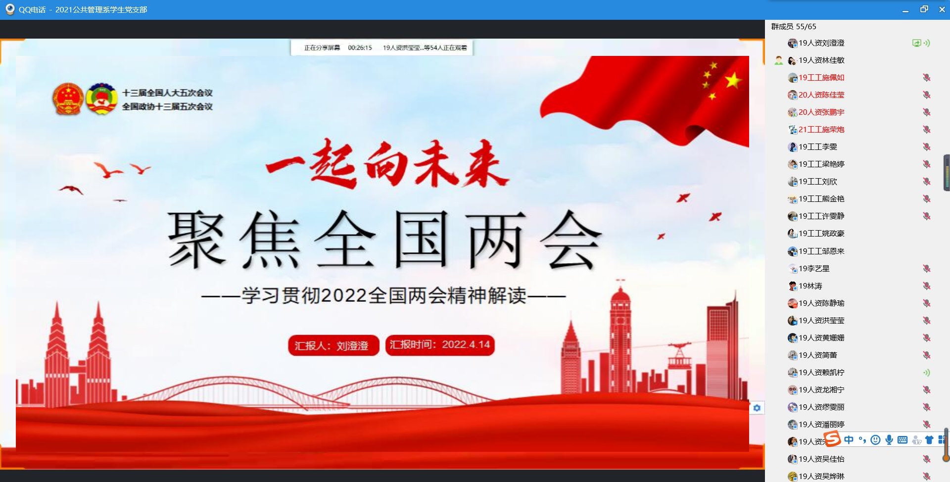 为认真学习贯彻2022年全国“两会”精神,切实增强党支部同志责任感、使命感和紧迫感。公共管理系学生党支部于4月15日在线上开展学习“两会”精神主题分享会,积极推动2022年全国两会精神入脑入心入行。