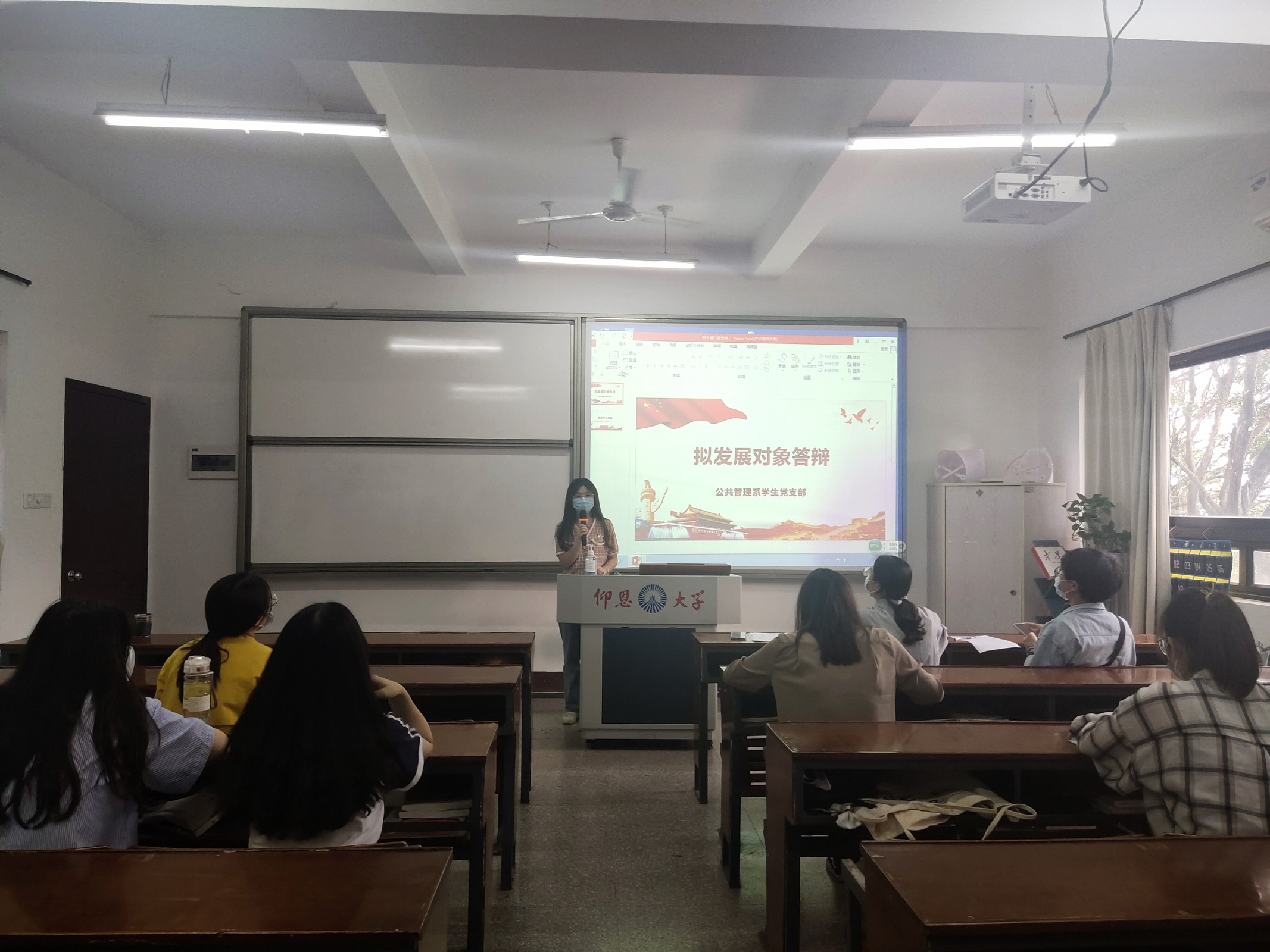为了严格把控党员发展关,深入细致审查拟发展对象的入党动机、理论素养和政治觉悟等,保证党员发展质量,更好地发挥党员先锋模范作用,公共管理系学生党支部于4月28日在共和楼216教室开展“拟发展对象”答辩会。本次答辩会由公共管理系学生党支部书记叶丽香、天天摸天天操党总支宣传委员洪晓徽、支部支委及16名拟发展对象参加。