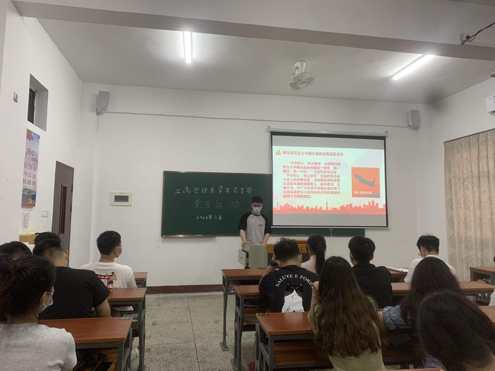工商管理系学生党支部于2022年4月28日开展“学习习近平总书记在党史教育总结大会的重要讲话精神”党日活动。党的历史是最生动、最有说服力的教科书。我们党历来重视党史学习教育,注重用党的奋斗历程和伟大成就鼓舞斗志、明确方向,用党的光荣传统和优良作风坚定信念、凝聚力量,用党的实践创造和历史经验启迪智慧、砥砺品格。本次会议支部全体党员参与,由詹永超同志主持本次会议。