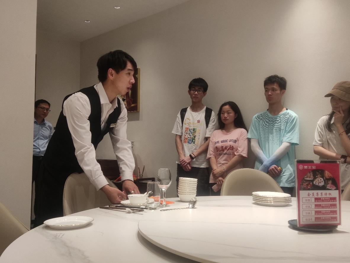 校车抵达凯里亚德酒店后,在孙总的带领下,同学们首先学习实践了第一门课程餐桌礼仪。来到了酒店包间,服务总监先给同学们进行了餐桌摆盘的培训,随后,孙总给同学们普及了酒桌文化以及餐桌礼仪在商务宴请中的实际应用,学生们主动与服务总监进行沟通和交流。