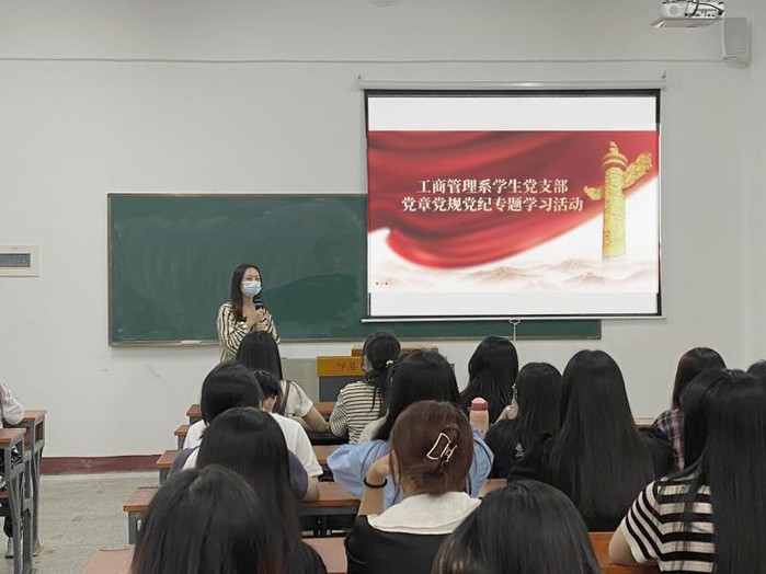 为了深入学习贯彻党的二十大精神,坚定不移推进全面从严治党,扎实开展党章学习,提高党员政治站位,强化党员政治担当,切实提升党员党性修养,充分发挥党员示范作用,2023年6月14日下午,工商管理系学生党支部于祥贤楼101室开展2023年党章党纪专题学习,工商管理系全体党员参与此次活动。工商管理系学生党支部书记李超楠老师主持进行集中学习。
