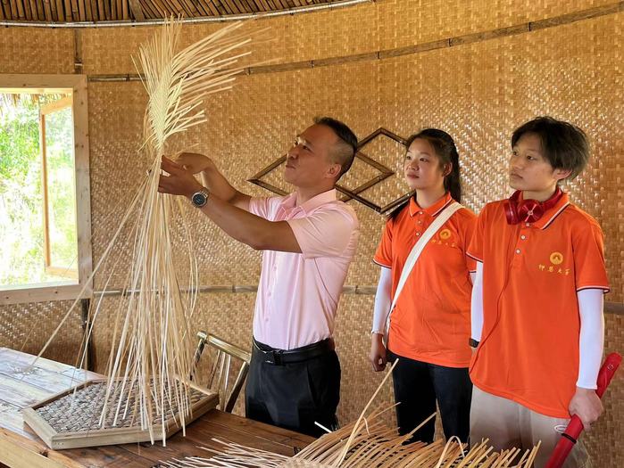(传承人向实践队员讲解竹编编制奥秘)