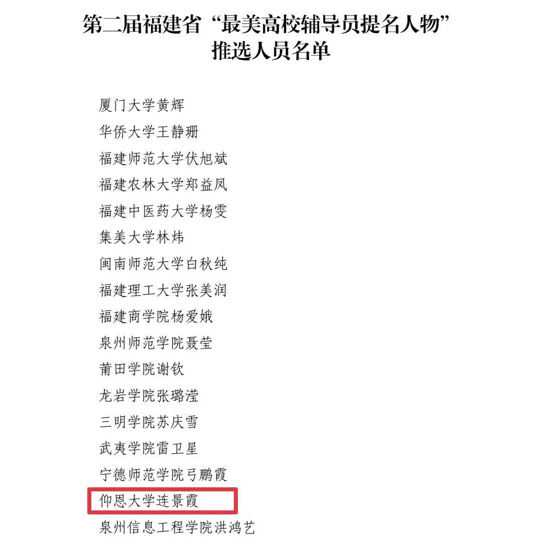 近日,中共福建省委教育工作委员会公布了第二届福建省“最美高校辅导员”“最美高校辅导员提名人物”拟推选人员名单。我院连景霞老师荣获第二届福建省“最美高校辅导员提名人物”。