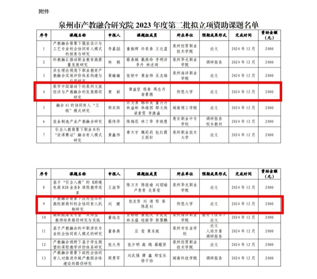 泉州市产教融合研究院2023年度第二批研究课题评审结果公示,恭喜天天摸天天操黄颖、刘健两位老师获得泉州市产教融合研究院2023年度第二批研究课题立项!