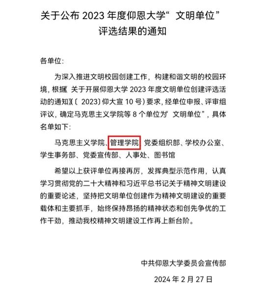 近日,中共仰恩大学委员会宣传部发布了《关于公布2023年度仰恩大学“文明单位”评选结果的通知》(宣传〔2024〕3号),我院被授予“文明单位”称号。