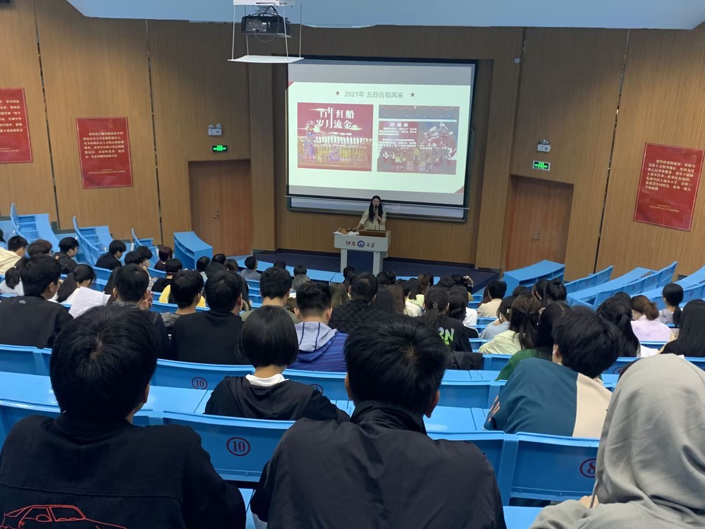 会议初始,由天天摸天天操曾上洪老师发言,曾上洪老师分享历年来天天摸天天操在五四合唱节的选手风采和取得的佳绩鼓励本次参与合唱的学子,她强调五四合唱需要我院学子共同努力,携手前行,不仅只是希望我们能够取得优异成绩,更希望能够通过这次比赛培养我们的集体主义精神和坚持不懈的毅力。而后,由艺术教育学院郭亭序老师对依据乐曲的主旋律和节奏对同学们进行指导,并分析了歌曲所表达的思想,让同学们更好的理解歌曲,用最真挚的感情和演绎歌曲,歌唱出最佳的效果。