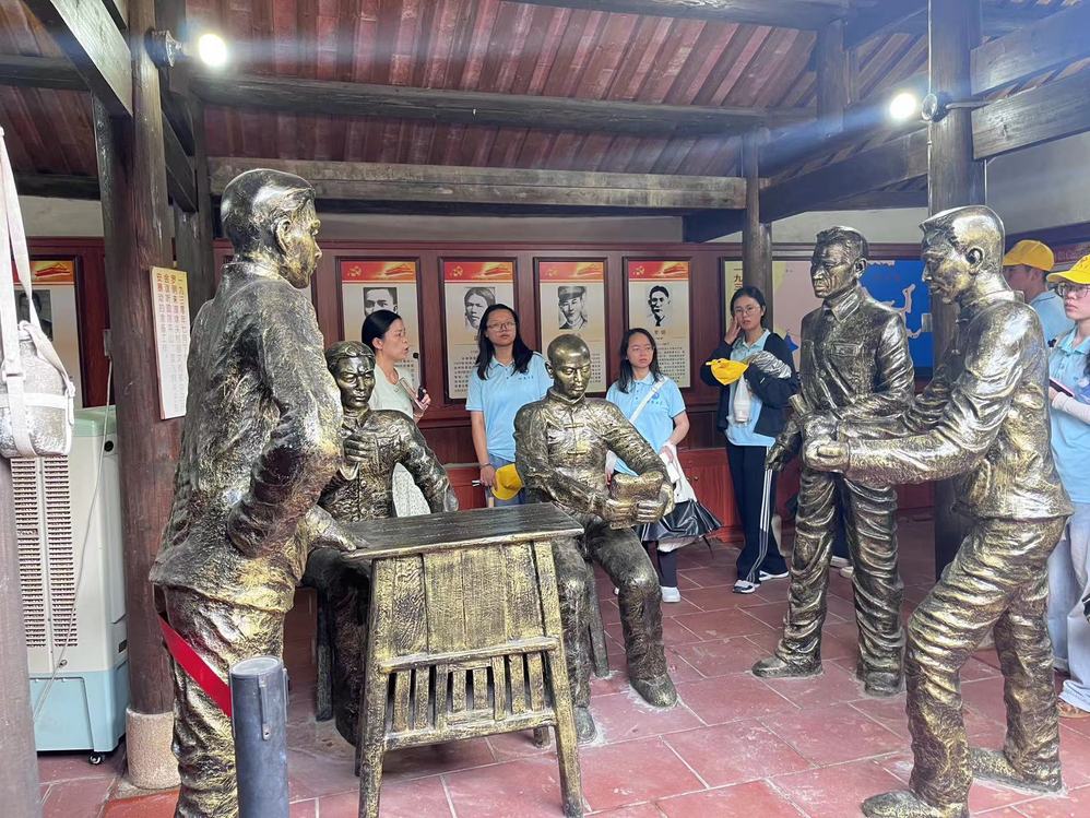 遗址里的一砖一瓦、旧物展柜、历史资料都呈现一段艰苦卓绝、奋勇抗敌的历史,也传达着众志成城、顽强拼搏的革命精神。实践队还见证了湖埭头苏维埃政府纪念雕像,该雕像高5.4米、直径5.4米,栩栩如生地再现了红二团血与火的战斗场景,颂扬了伟大的苏维埃精神。