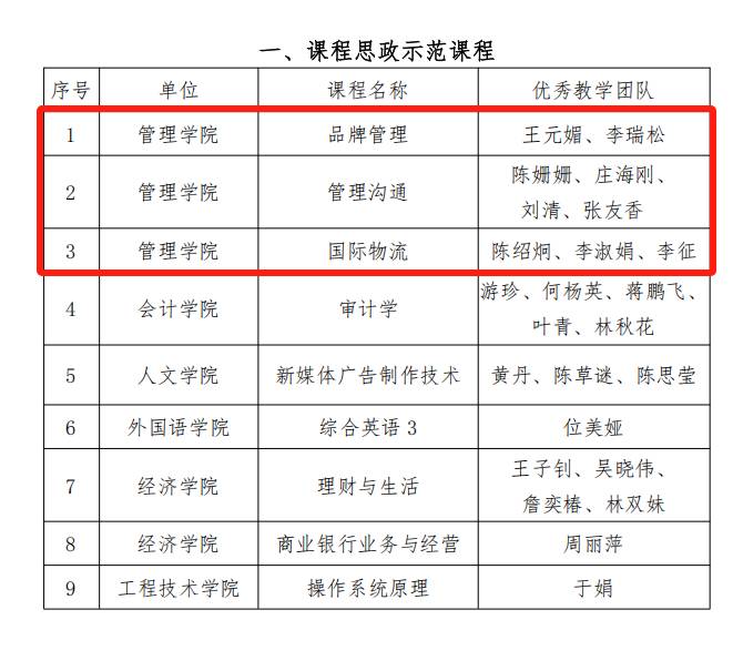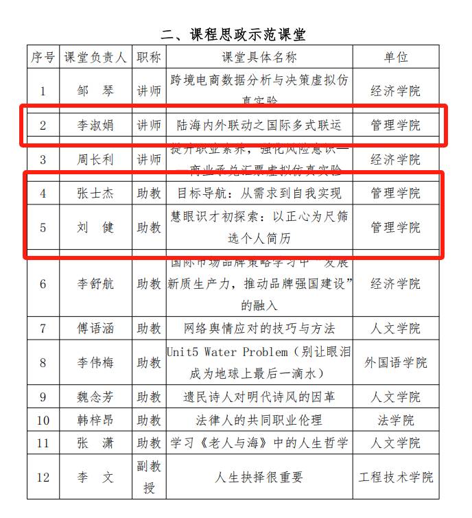 3月19日,仰恩大学教务部印发《关于公布2024年度“课程思政示范课程”“课程思政优秀教师、教学团队”和“课程思政示范课堂”获奖名单的通知》(仰大教〔2025〕10号)文件,对在2024年度校级“课程思政示范课程”、“课程思政优秀教学团队”和“课程思政示范课堂“中涌现出的先进集体和个人进行表彰。我院《品牌管理》、《管理沟通》、《国际物流》课程成功入选课程思政示范课程,李淑娟老师讲授的《陆海内外联动之国际多式联运》和张士杰老师讲授的《目标导航:从需求到自我实现》及刘健老师讲授的《慧眼识才初探索:以正心为尺筛选个人简历》成功入选课程思政示范课堂。