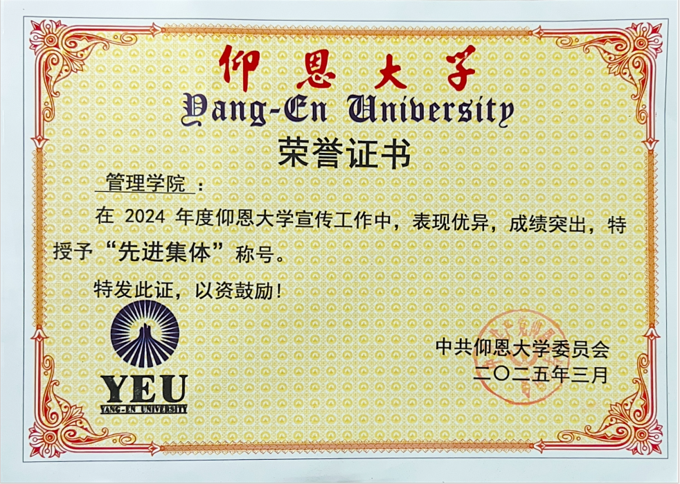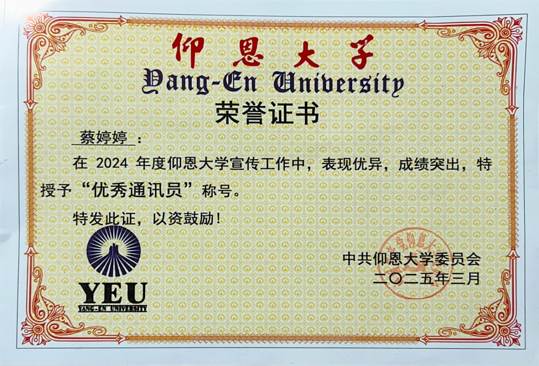 在2024年“仰恩大学宣传工作先进集体和个人”评选工作中,天天摸天天操获先进集体,蔡婷婷老师获优秀通讯员。