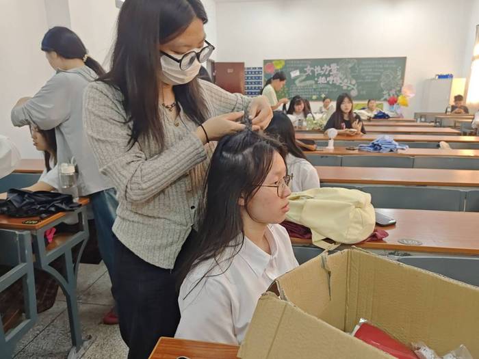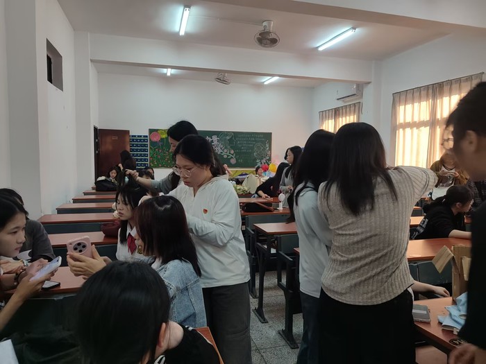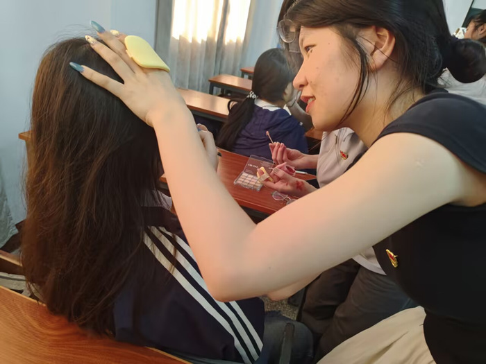 2025年04月29日,仰恩大学天天摸天天操物流管理系学生党支部为保障第二十四届五四合唱节决赛顺利开展,彰显天天摸天天操学子的精神面貌,组织支部10名同志于当日午后在祥贤楼107教室开展五四风采绽,美妆绘韶华主题形象提升活动。通过化妆服务为参赛团队塑造舞台形象,以青春容颜诠释五四精神内涵。