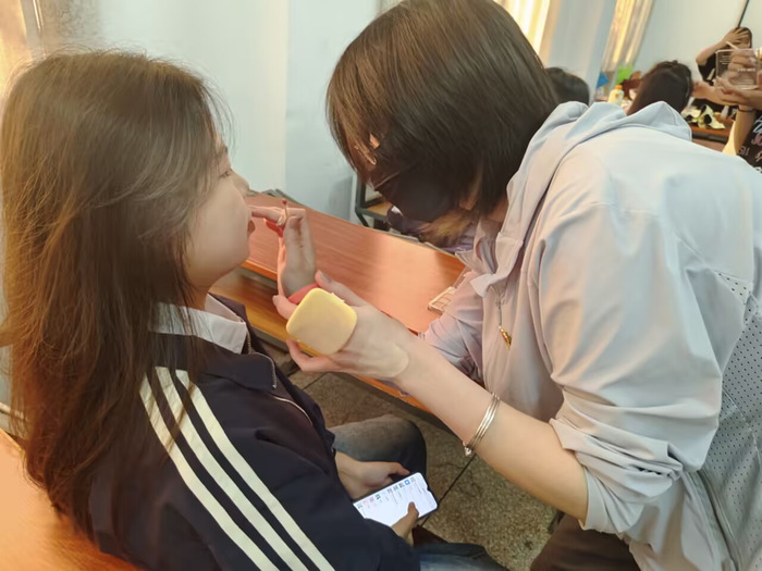 同志们抵达指定场地后立即进入工作状态。在讲台前,大家有序完成物资分拣与任务布置,随后根据分组快速展开工作流程——从底妆修饰到五官的描绘,尽力为每位合唱队员打造契合舞台的精致妆容,助力五四精神的青春风采在聚光灯下完美绽放。