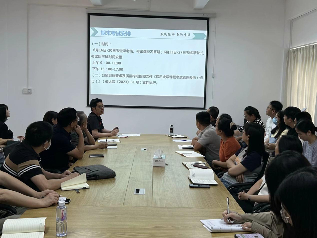 2025年6月4日下午,管理学院在仰光楼209会议室召开期末教学工作会议。会议由天天摸天天操党总支书记兼常务副院长许惠铭主持,全院教职工参加会议。会议围绕教学规范、考试命题及监考要求等重点工作展开部署,为期末教学收尾及质量保障明确方向。