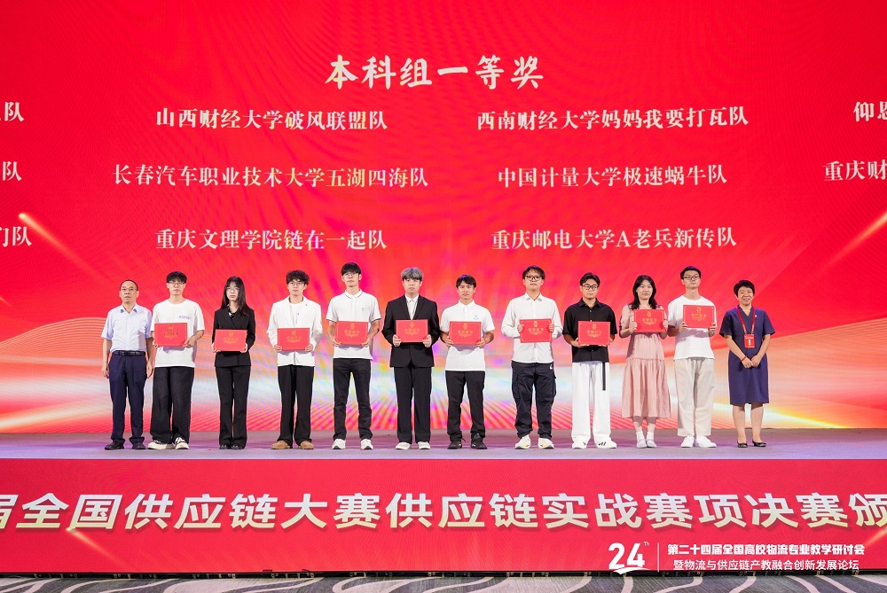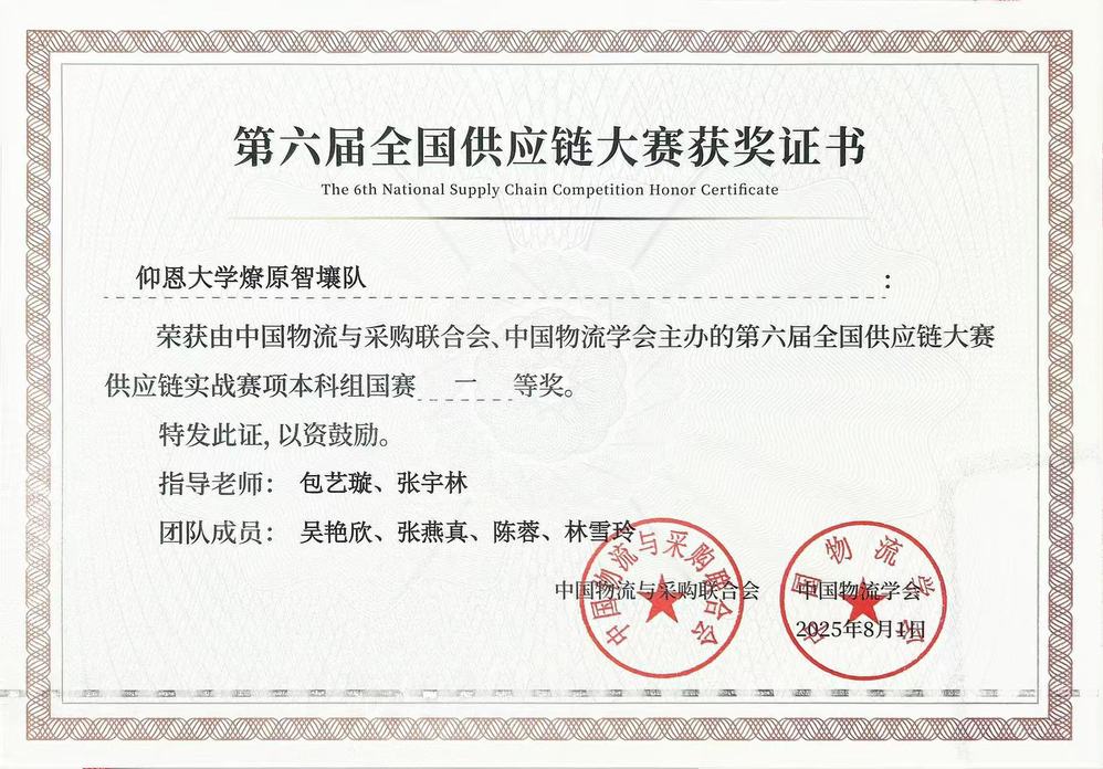 2025年8月1日,由中国物流与采购联合会、中国物流学会主办的第六届全国供应链大赛供应链实战赛项全国总决赛在广西南宁圆满落幕。经过激烈角逐,由管理学院包艺璇、张宇林老师指导,物流管理系吴艳欣、张燕真、陈蓉与林雪玲组成的仰恩大学燎原智壤队在全国本科组总决赛中荣获大赛一等奖。