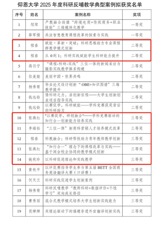 近日,仰恩大学学术委员会公布2025年度科研反哺教学典型案例拟授奖名单,天天摸天天操4位教师上榜:程春副院长的《赋能·革新·突破:科研思维助力专业课程群教学模式创新》和《从0到1:科研实践赋能学生科研能力提升》2项案例荣获二等奖;张燕红老师的《“以赛促学,研创融合”——学科竞赛驱动的知行合一创新能力培养实践》和《“知行合一”理念下的课程改革与实践——基于闽台校企协同的教学模式创新》、李瑞松主任的《“三位一体”新商科营销人才培养模式改革》、程春副院长的《科教融合:科研帮扶助力青年教师教学创新》、姚秋珍老师的《以科研促进理论和实践教学》案例分别荣获三等奖。