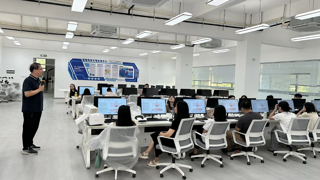 本次培训由平台培训负责人谢飞老师担任主讲。他系统介绍了该平台以数字商业全景为基础,融合数字孪生、VR、AI等前沿技术,构建起“数字企业—产业链—商业社会”三层仿真教学环境,覆盖智能制造、智慧物流等多个数字化场景,并完整模拟新能源汽车行业从采购、生产到营销的全流程运作。谢飞老师还现场演示了平台的任务系统、数据看板与协同工作系统,详细解析“业务经营+决策经营”两阶段教学模式,助力教师实现理论传授、职业素养与实操能力的一体化培养。此外,就配套教学安排与评价体系作了具体说明,为教学实践提供实用指导。在交流环节,参会教师围绕平台与专业课程的适配性、教学案例开发等议题踊跃提问,现场气氛热烈。